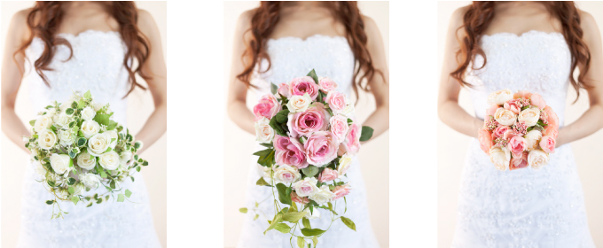 花嫁さんにふさわしい、バラを基調にしたラウンド型もしくはキャスケード型のブーケとお揃いのブートニアです。