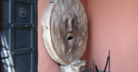 映画 ローマの休日で一躍有名になったが、もとは中世の時代に、サンタマリアデッラコスメディン教会の前にもってこられたローマ帝国時代につかわれていたマンホールのふただったと言われている。嘘つきは、口にてを入れると手をかみちぎられるという中世のいいつたえがあり、口に手をいれて写真をとるために観光客が終日列をつくっている。 |