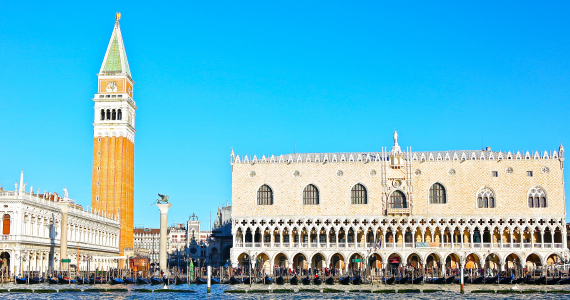 | 世界で最も美しい広場と言われている、昔の海上交通が主であった時のベネチアの玄関口です。無数の鳩が飛び交い、周りを取り囲む回廊には、伝統的なカフェからピアノやヴァイオリンの音色が聞こえ、旅情を掻き立ててくれます。サンマルコ寺院や鐘楼が映る風景はあまりにも有名で、ここで是非フォトストップを。 |