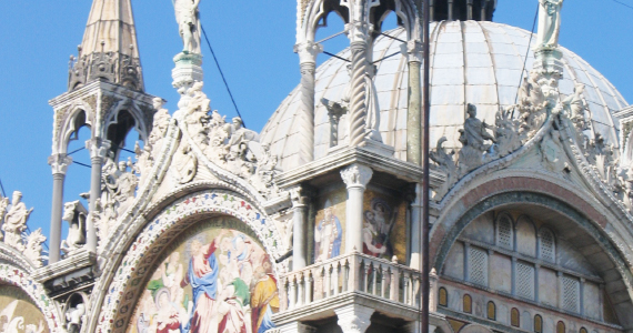 ベネチアを代表する建物で、9世紀に建てられた教会です。イタリアの都市には、必ず守護聖人というキリスト教上の守り神が各都市におり、ベネチアの守護聖人聖マルコが祀られているため、この名前になっています。 ベネチアのシンボルである、翼のある獅子も寺院の至る所で目に入ってきます。3つのドームがサンマルコ寺院のシンボルで中に入ると金の装飾で覆い尽くされており、ベネチアの栄華を偲ばせています。 |