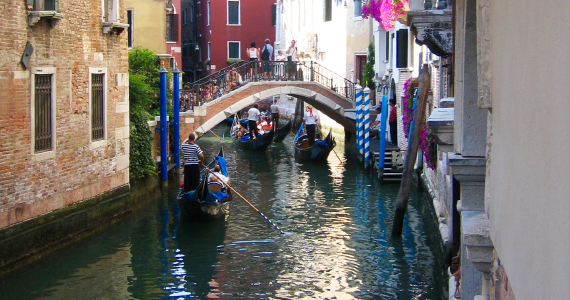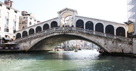 | ベネチアには、200あまりの運河と400近くの橋が架けられていると言われていますが、一番有名なカナルグランデという大運河に渡されています、大理石造りの一番有名な橋です。リアルト橋の近くがヴェネツィアが一番最初に栄えた場所と言われており、金融業で発達したと言われるので、リアルト橋は東京で言うと日本橋のようなところです。ダ・ポンテという人に架けられましたが、イタリア語でポンテは橋の意味です。 |