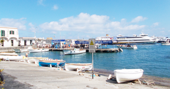 | 高速船でナポリやほかの街から到着、出発する際の港。 車両をのせれる大きなフェリーは通常21番線に停泊するので、 ほかの小さな高速船の乗り場とは50Mほど離れています。 周囲にはお土産屋さん、ホテル、レストランなど港らしいにぎわいで、 高速船の切符売り場、バスや登山電車の切符売り場もここにあります。 また、切符売り場の横は自由に海水浴ができる砂浜で、 その隣には、レストランを併設した海の家もあります。 |