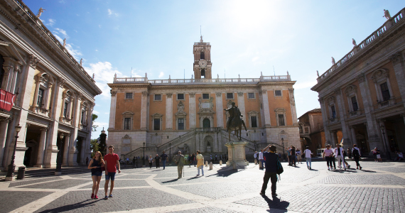 もとはローマ帝国時代に公文書の保管場所としてつかわれていた建物の上に13世紀にコンセルバトーリオ宮殿という建物がたてられ、広場の幾何学模様は、ミケランジェロが設計したといわれる美しい広場となっている。現在はローマ市庁舎として、市長が政治を行っており、ローマの中心の役割を果たす重要な建物。背後にフォロロマーノを一望できるフォトスポットがあり、年中人が絶えない。 |